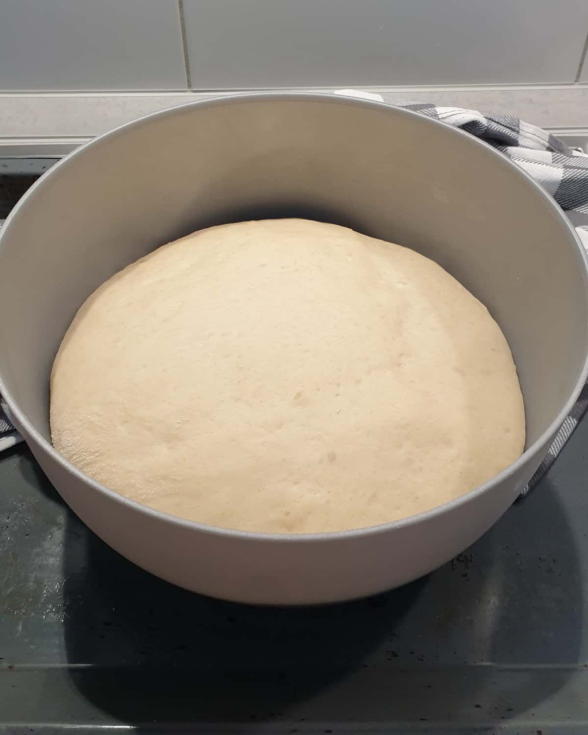 In einer grauen Schüssel ein hochgegangener Hefeteig.