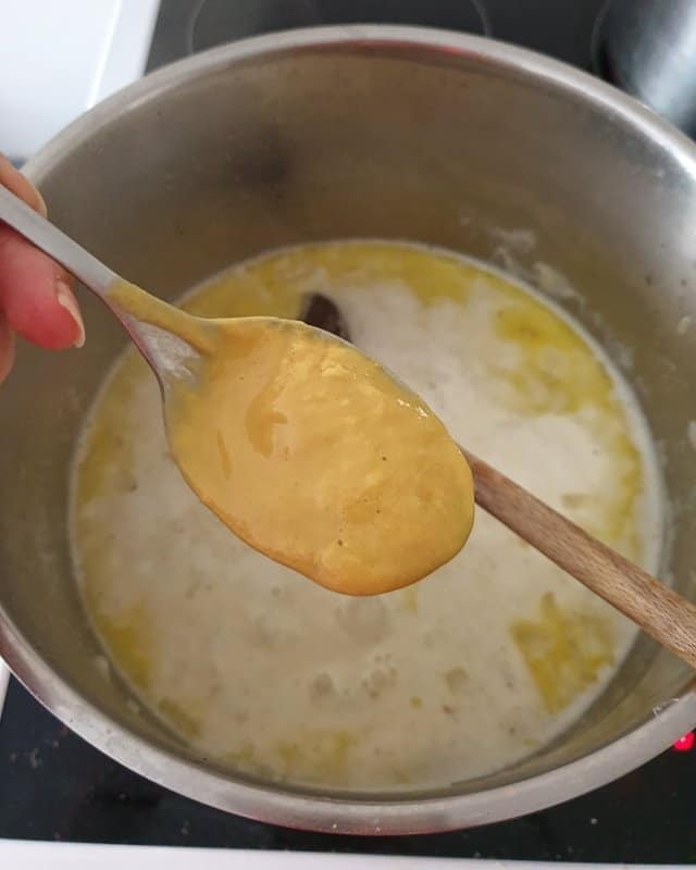 - Anschließend das Kochwasser und die Sahne angießen, die Gemüsebrühe dazugeben.