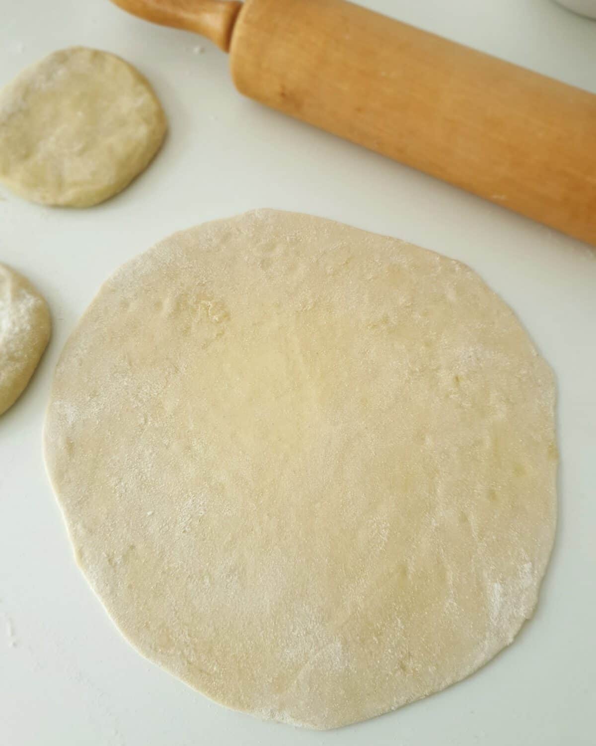 - Den Teig in 6 gleich große Portionen teilen und zu einer Kugel formen. Die Kugel mit der Hand flach drücken. Anschließend auf einer bemehlten Fläche ausrollen.