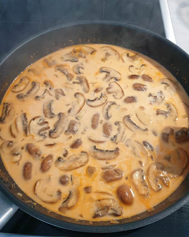 Tipp: Wenn du deine Soße noch etwas herzhafter kochen möchtest, kannst du etwas Speck in der Pfanne anbraten bevor du die Zwiebeln und die Pilze andünstest.