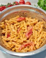 Italienischer Nudelsalat mit selbstgemachtem roten Pesto und Rucola. Schnell gemacht und perfekt zum Grillen oder als Mitbringsel fürs Partybuffet.