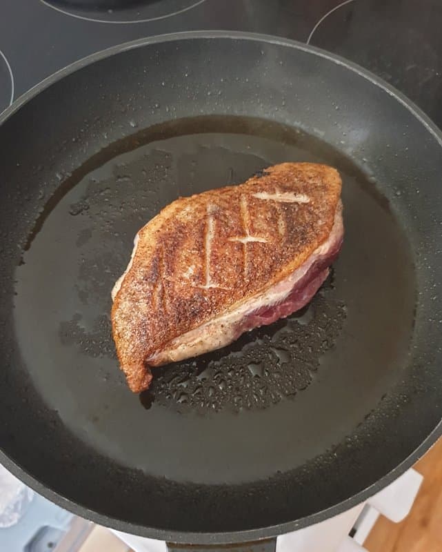 - Die Entenbrust wenden und auf der anderen Seite ebenfalls scharf anbraten.