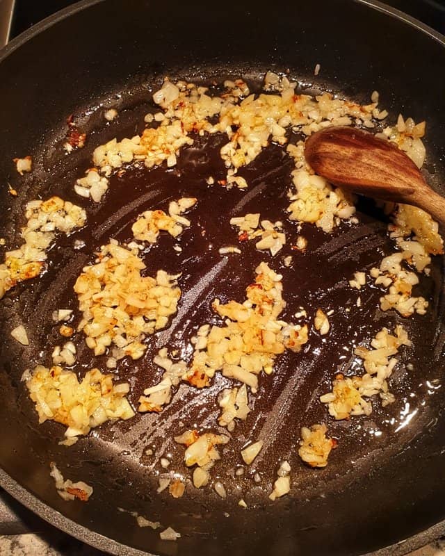 - Das Tomatenmark mit in die Pfanne geben und anrösten.