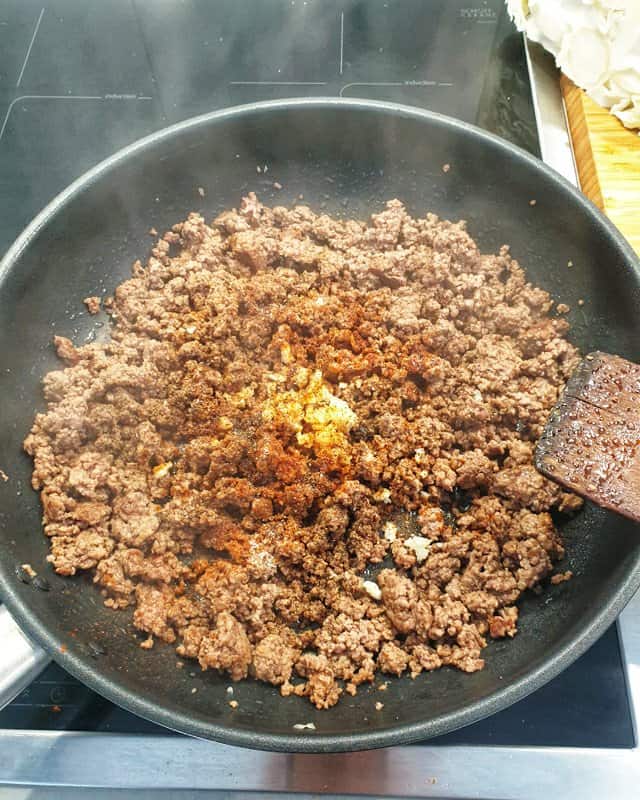 Erhitze eine Pfanne mit etwas Öl und brate das Hackfleisch darin krümelig an. Wenn das Hackfleisch angebraten ist, gibst du die Gewürze: Paprikapulver, Kümmel, Salz und Pfeffer dazu und vermischst sie mit dem Fleisch. Den Knoblauch ebenfalls dazugeben und kurz andünsten.